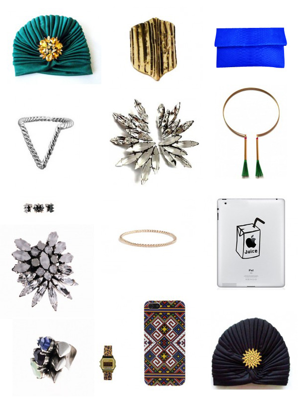 Turban Emeraude VIBE JEWELS (29 €), Bague Duffy AZ’TEK (30 €), Pochette Python Bleu Néon LIN (110 €), Bague V Torsadée MON COFFRET A BIJOUX (20 €), Boucles d’Oreilles Epicure CREZUS (90 €), Collier Goa ASHWINA VADSARIA (40 €), Set de 3 bagues Skeletos CREZUS (124 €), Alliance Torsadée MON COFFRET A BIJOUX (12 €), Sticker Jus iPad 2 TARGET IT (12 €), Bague Oberoi CREZUS (78 €), Bijou d’Oreille Radius CREZUS (38 €), Montre Eve NON COMESTIBLE (50 €), Coque Kilim iPhone 5/5S TARGET IT (10 €), Turban Star Noir VIBE JEWELS (29 €)